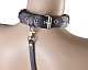 Ошейник изготовлен из натуральной кожи, декорирован шестью металлическими кольцам. Размер регулируется при помощи пряжки. Поводок кожаный.