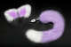Серебристая анальная пробка с фиолетово-белым хвостиком и ободком-ушками