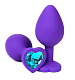 Фиолетовая силиконовая анальная пробка с голубым стразом-сердцем - 8,5 см.