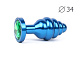 Коническая ребристая синяя анальная втулка с зеленым кристаллом - 8 см.