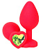 Красная силиконовая анальная пробка с лаймовым стразом-сердцем - 8,5 см.