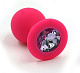 Анальная пробка из силикона розового цвета, размер M. Страз в основании круглой формы, выполнен из стекла светло-фиолетового цвета. Упакована в вельветовый мешочек для хранения. Вес - 46,5 граммов.