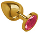 Золотистая большая анальная пробка с малиновым кристаллом - 9,5 см.