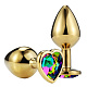 Золотистая гладкая анальная пробка с разноцветным кристаллом-сердечком - 6,8 см.