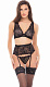 Кружевной эротический комплект: бюстгальтер с мягкими чашками на каркасах, пояс с подвязками для чулок и трусы-стринги. В комплекте: бюстгальтер, пояс, трусики-стринги. Чулки не входят в комплект!