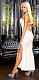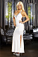 Элегантное вечернее платье белого цвета с широким вырезом, украшенным прозрачными переливающимися камнями с огранкой. Платье эротично завязывается на полуоткрытой спине тонкими перекрестными завязками, а также на шее на мягкие эластичные ленты.
