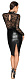 Платье до колен с длинными рукавами, в обтяжку, строгий крой в черном элегантном сочетании мягкого кружева (верх) и матового блестящего материала wet-look (часть юбки). Небольшой воротник-стойка, застегивающийся на 2 пуговицы сзади. Небольшой разрез на подоле сзади.
