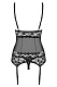 Элегантный корсаж, изготовленный из прозрачной вуали и узорчатого кружева. Чашечки корсажа на косточках с тонким поролоном снизу визуально делают грудь пышнее. Декоративный бантик и сверкающая подвеска привлекают внимание к зоне декольте. Бретели регулируются по длине. Низ корсажа также выполнен из кружева. Пажи позволяют дополнить корсаж чулочками. В комплекте: корсаж и трусики-стринги.