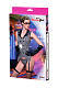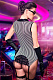 Мягкий трикотажный полосатый корсет с отложным воротником и отстегивающимися пажами. Вертикальный рисунок зрительно вытягивает силуэт. Английская кружевная оборка сзади акцентирует внимание на ягодицах. G-стринги, чулки из крупной сетки с эластичной резинкой и уплотненными носочком, перчатки до локтя и очки — в комплекте. В комплекте: корсет с пажами, трусики-стринги, чулки, перчатки, очки.
