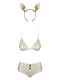 Блестящий костюм Neo Goldes состоит из бюстгальтера, трусиков, ободка с кроличьими ушками и чокера с бантиком. Бюстгальтер с мягкими треугольными чашками, бретели регулируются по длине, на спинке удобная застежка. Трусики с высокой талией, сзади украшены белым помпоном, спереди рядом пуговиц. Этот костюм доставит вам массу удовольствия и одновременно подчеркнет ваши женственные изгибы. В комплекте: бюстгальтер, трусики, ободок с ушками, чокер.
