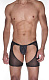 Черного цвета джоки, оригинального пошива. Трусы сшиты из двух видов материалов - мелкой сетки и черного тянущегося гладкого материала на гульфике в мелкую поперечную полоску. Ягодицы полностью открыты. Пояс неширокий, хорошо тянущийся.