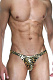 Мужские золотистые трусы-слипы с черными буквами.