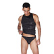 Комплект для мужчин, состоящих из классических трусов-тонгов и майки-борцовки. Комплект отшит из гладкой черной тянущейся ткани. В комплекте: трусы, майка.