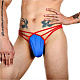 Синие сексуальные трусы-стринги на тонких красных бретелях.