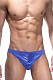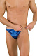 Синие трусы-тонги с застежкой сбоку и сатиновым блеском.