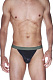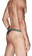 Черные трусы-тонги из гладкого блестящего материала. Трусы с низкой посадкой, на широкой резинке камуфляжного цвета.