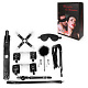 Великолепный набор аксессуаров для любителей БДСМ. В комплект входят кляп, наручники, оковы, ошейник, поводок, верёвка, маска, плеть. Кляп состоит из пластмассового шарика с отверстиями для дыхания и ремней с возможностью регулировки размера. Наручники и оковы снабжены металлической цепочкой, которая позволяет скреплять изделия вместе. Внешняя сторона наручников, оков, ошейника и маски выполнена под кожу, внутренняя отделана мехом, который предотвращает натирание кожи. Плеть-флогер состоит из хвостов и отделанной искусственной кожей рукоятки с петлей. В комплекте: маска, кляп, зажимы, плётка, ошейник, наручники, оковы, щекоталка, фиксатор.